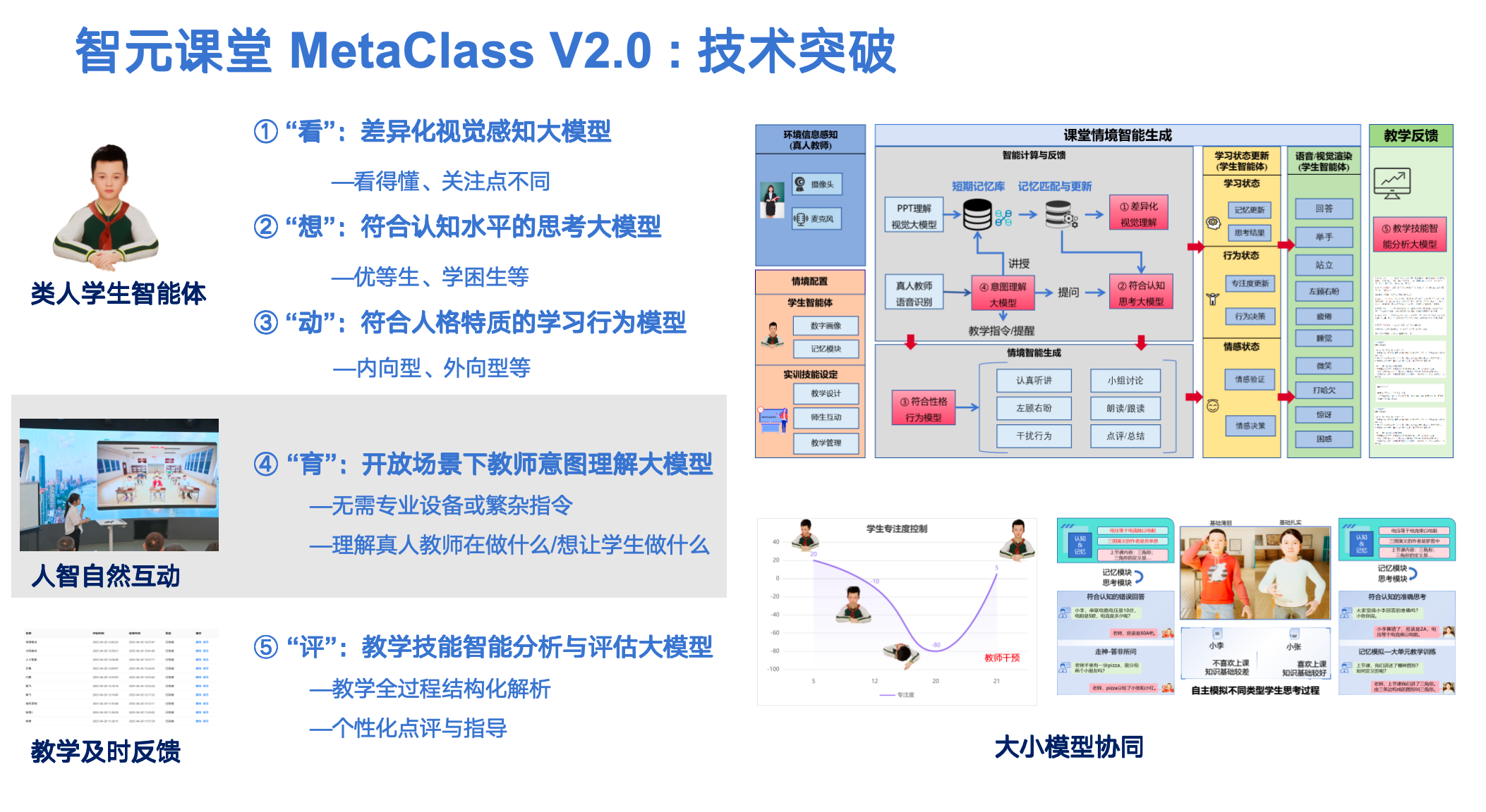 研讨会上,正式发布了全国首个教师教育大模型——“智元课堂(MetaClass)”2.0版本。新版本中的学生智能体具备“看、想、动、育、评”五大核心功能,全面支持“人智协同”的师范生培养新模式。